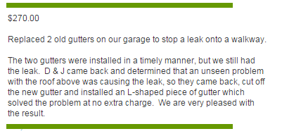 I called D & J Gutters based on customer review and certainly wasn't disappointed. They had a cancellation so called to see if it was OK for them to do the work the same afternoon. I was happy to oblige!