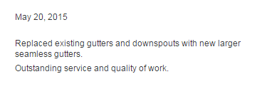 The provider came out same day for an estimate. When I got around to scheduling the service it was a bit of back and forth phone tag to schedule the work but when Johnny and his crew showed up, they did quality work and a quick pace. They replaced the damaged gutter with great looking product and then cleaned the rest of the gutters. When I replace the rest of the gutters I'll definitely give them a call back.